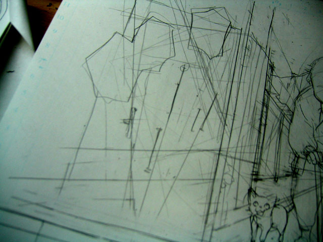 その後テケトーにパースを取って、原稿全体のアタリを入れていきます。