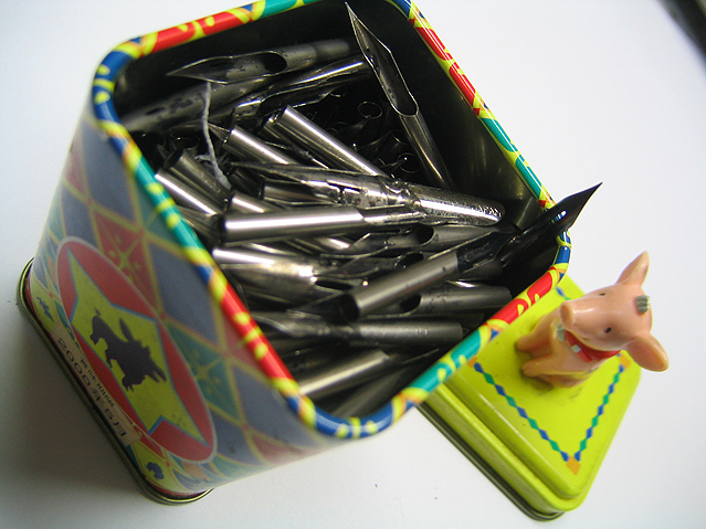 この飴の缶の中には、使い終わったペン先を溜めています。